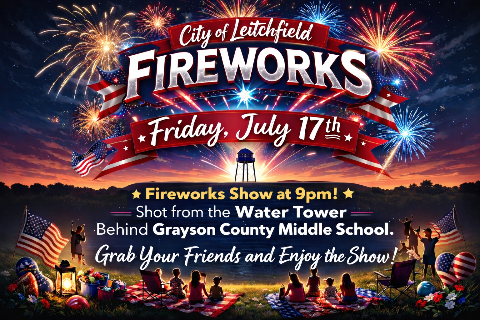 The City of Leitchfield Fireworks will be on Friday, July 17th. The fireworks will be shot from the water tower behind the Grayson County Middle School. This is a stand alone event, so grab your friends and gather in your favorite location and enjoy!