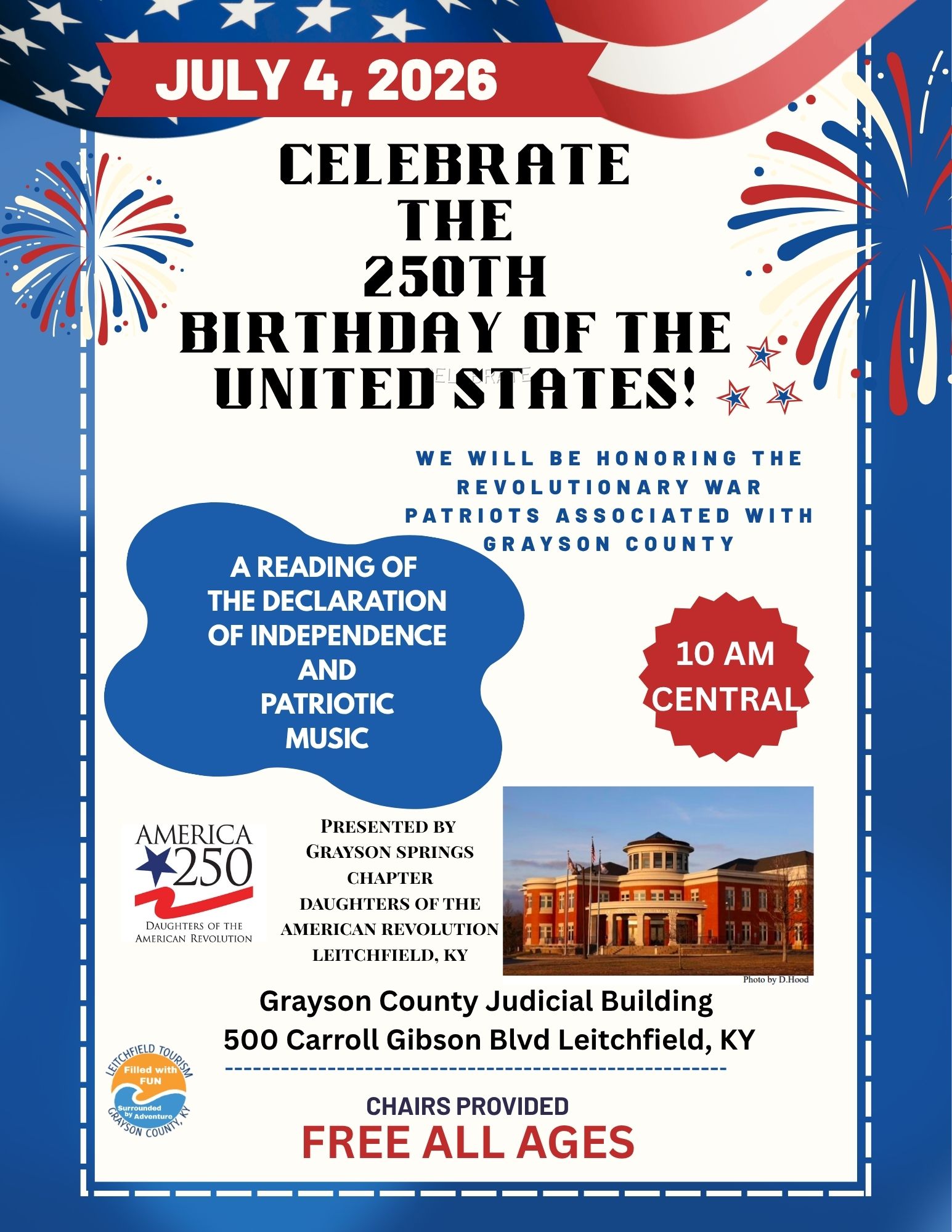 Celebrate the 250th birthday of the United States! We will be honoring the Revolutionary War Patriots associated with Grayson County. Enjoy a reading of the Declaration of Independence and patriotic music on July 4th, at the Grayson County Judicial Building beginning at 10 am (cst)